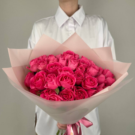 Роза кустовая - 3;Лента атласная - 1;Эустома - 2;Хризантема кустовая белая - 3;Современная упаковка - 1;Русскус отеч. - 5;Роза Мисс Пигги (50см) РОССИЯ - 5;